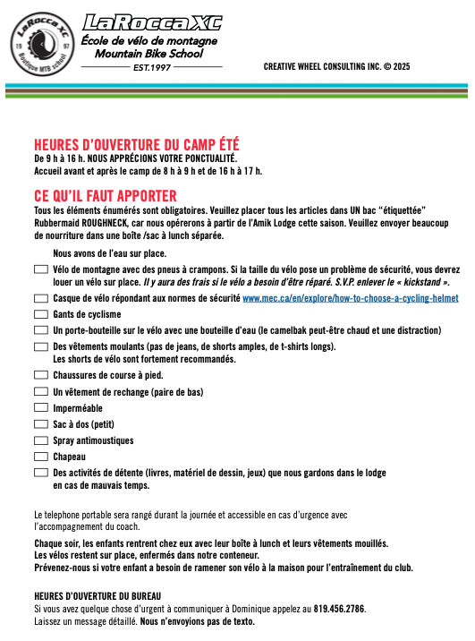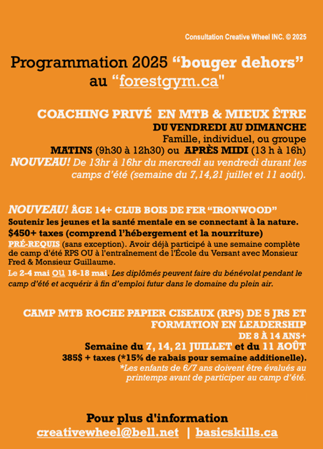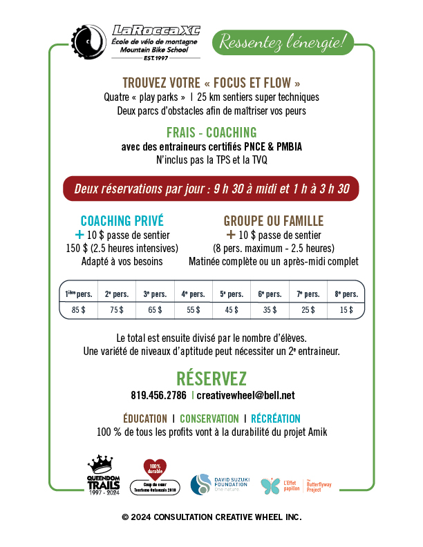 Nous sommes de retour en pleine forme au printemps 2025, avec de nombreux changements au réseau de sentiers, y compris une toute nouvelle route vers le sommet de la montagne (chemin Bernier), 100% durable. Des camps d'été, des programmes de leadership et une nouvelle offre pour les femmes (option de jour ou de fin de semaine) appelée « Le game changer ». Envoyez un courriel à creativewheel@bell.net ou appelez au 819.456.2786 pour plus d’information. L'équipe est enthousiaste à l'idée de partager ses connaissances !
